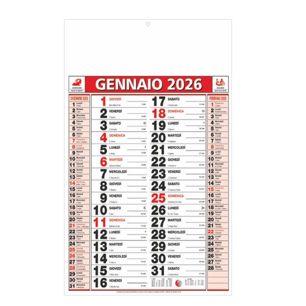 Calendario olandese classico. Trimestrale 12 fogli. Testata pressofusa. Carta patinata. Colori: blu, verde, rosso. Dimensioni: cm 28,8x47, testata cm 28,8x9,8.